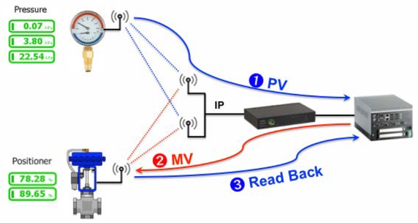 Prevádzková veličina (PV), ktorou je v tomto prípade tlak, sa posiela do regulátora. Na základe tohto vstupu a iných okolností, posiela regulátor akčný zásah do akčného členapolohovacieho zariadenia. Akčný člen pošle aktuálnu pozíciu naspäť do regulátora. Všetko toto sa musí odohrať v časovom rozpätí akceptovateľnom pre daný proces, v tomto prípade v intervale 1 až 2 sekundy. V praxi sa však málokedy vyskytuje aplikácia postavená 100 % na bezdrôtovom riešení. Zariadenie na vstupe môže byť bezdrôtové a na výstupe drôtové alebo naopak. V prípade rafinérie, ktorý je uvedený vyššie, bol snímač teploty bezdrôtový a akčný člen drôtový. Zovšeobecnená „vstupná úroveň“ je zobrazená na obr. 2. Bezdrôtový vysielač periodicky posiela cez sieť ISA100 údaje do regulátora. Regulátor spustí riadiacu logiku a použije káblové zbernicové prepojenie na prenos príkazu do akčného člena.