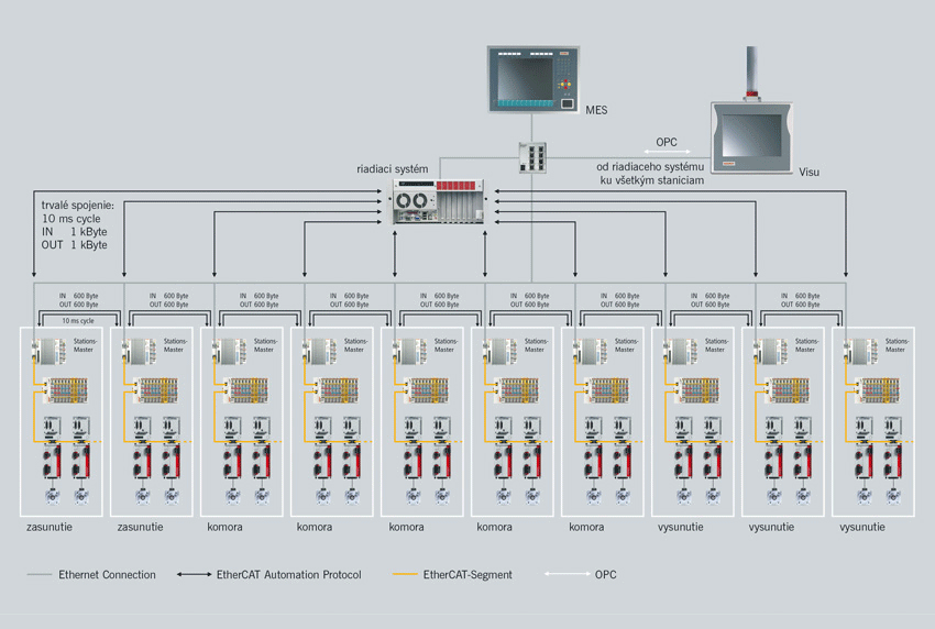 Vertikálna komunikácia so systémom HMI a MES je realizovaná cez OPC UA v paralelnej cyklickej komunikácii EAP. Obe technológie sa vzájomne dopĺňajú: EtherCAT ako ethernetová zbernica reálneho času pre stroje a riadenie výroby s využitím technológie EAP na výmenu údajov medzi mastermi a OPC UA ako platforma na ľahko rozšíriteľnú komunikáciu navrhnutú s ohľadom na bezpečnosť a umožňujúcu šifrovaný prenos údajov do systémov MES/ERP alebo do cloudu.
