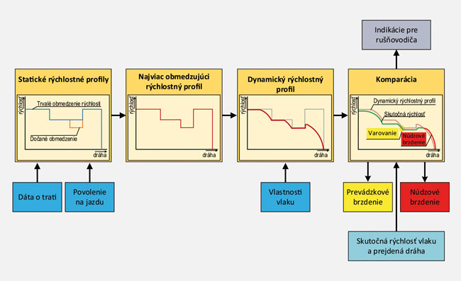 Spracovanie prenesených informácií palubnou jednotkou ETCS znázorňuje obr. 6. Zo statických informácií o trati, maximálne dovolenej rýchlosti vlaku a prijatom MA vypočíta mobilná jednotka najviac obmedzujúci rýchlostný profil, z ktorého na základe informácií o vlastnostiach vlaku (hmotnosti, brzdových schopnostiach a ďalších) mobilná jednotka vypočíta dynamický rýchlostný profil, ktorý určuje maximálnu dovolenú rýchlosť v každom okamihu jazdy vlaku.